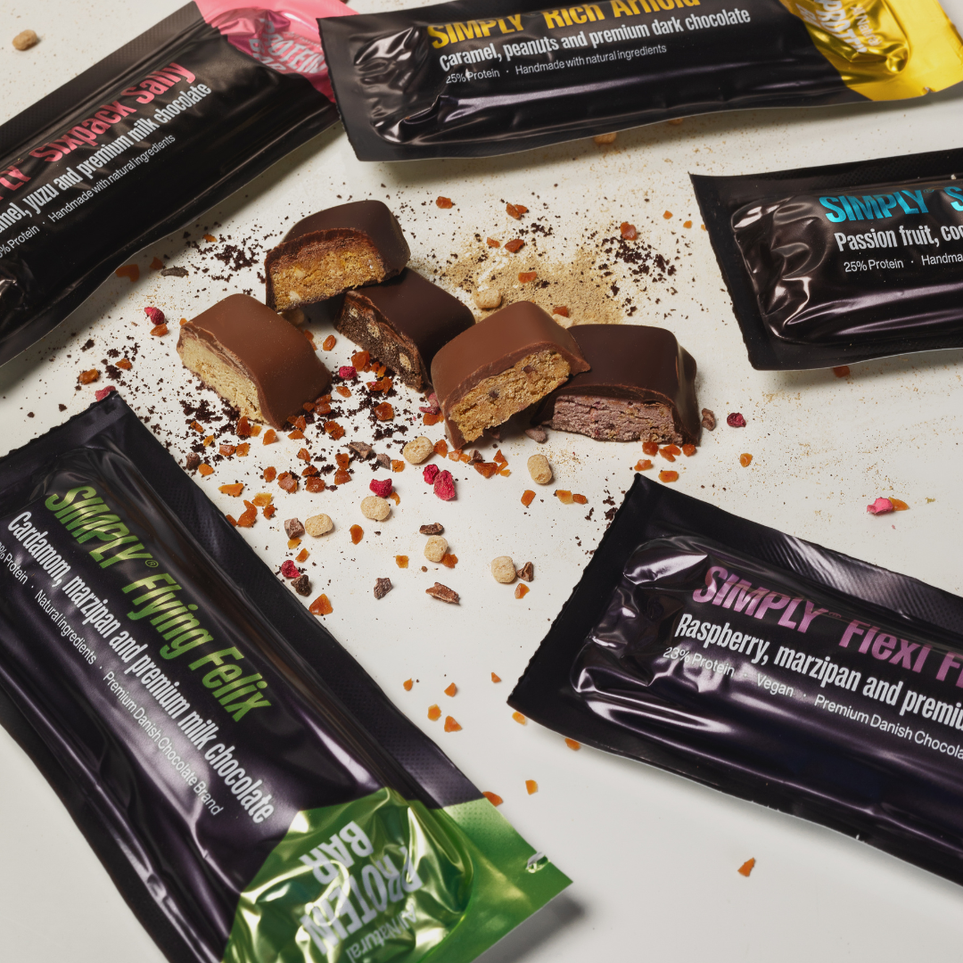 Give your workout a boost with our selection of delicious protein bars with chocolate, completely free of artificial additives. Gain superpowers after training with a natural protein bar from Simply® made from pure quality ingredients that actually taste good. Here in the webshop, you'll also find our complete range of protein bars gathered in a hard-hitting bar kit.
