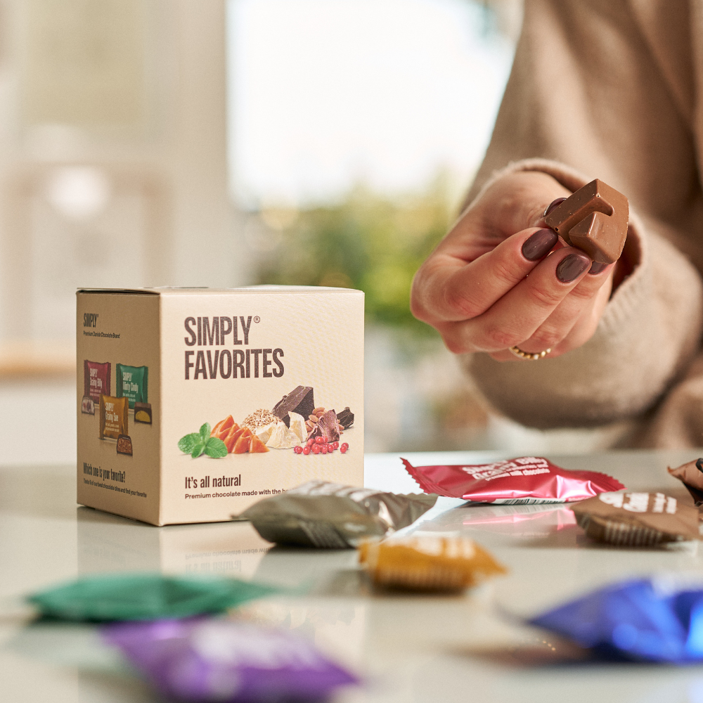 The chocolate from Simply® has both attitude and character, and you can be sure that it's produced with respect for both people and our planet. Treat yourself to our limited editions, where you'll find the unique among our temptations in glittering paper, visiting our regular assortment here and there. Our beautifully packaged chocolates are a true color spectacle, and the packaging speaks its clear language because the boxes from Simply® contain something truly extraordinary.
