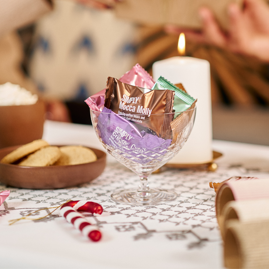 The chocolate from Simply® has both attitude and character, and you can be sure that it's produced with respect for both people and our planet. Treat yourself to our limited editions, where you'll find the unique among our temptations in glittering paper, visiting our regular assortment here and there. Our beautifully packaged chocolates are a true color spectacle, and the packaging speaks its clear language because the boxes from Simply® contain something truly extraordinary.