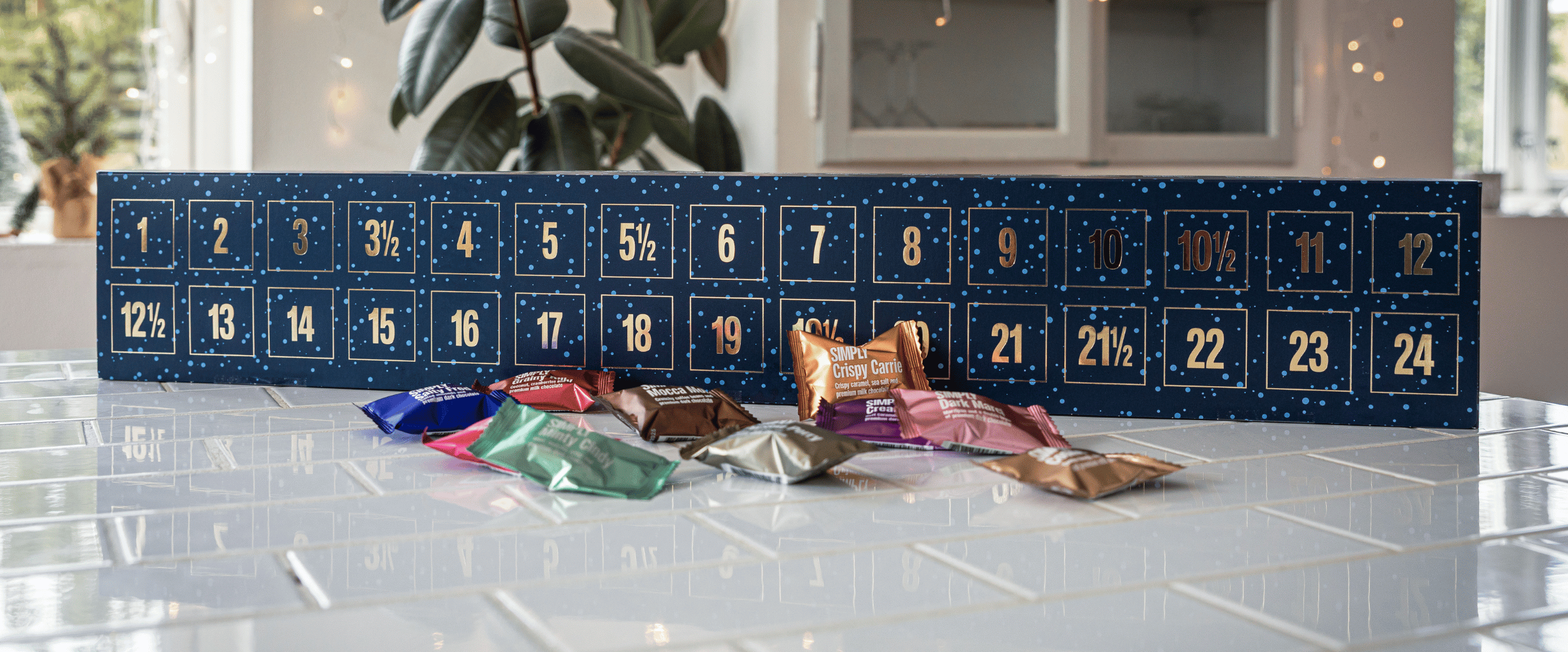 In the protein Christmas calendar Simply® Unwrap Your Energy, you’ll find protein bites inspired by our popular bars: Flexi Flora, Flying Felix, Rich Arnold, Sixpack Sally, and Speedy Tom.