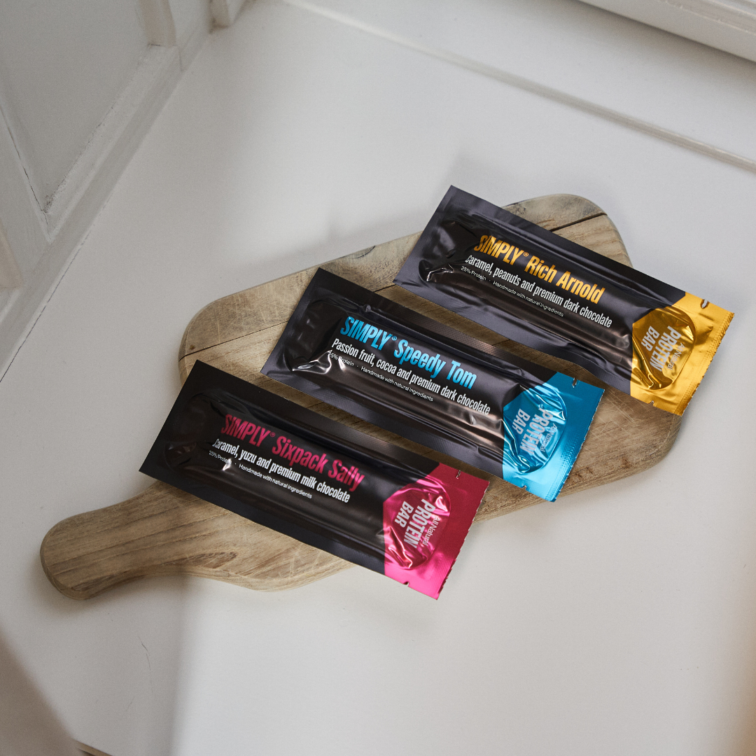 Simply® Rich Arnold, Simply® Sixpack Sally, and Simply® Speedy Tom are gluten-free and made with the finest natural ingredients, 25% protein, and we've steered clear of artificial sweeteners, flavors, and colorings. We simply believe that real ingredients and natural flavors taste better. Taste the difference and find your new favorite bar.